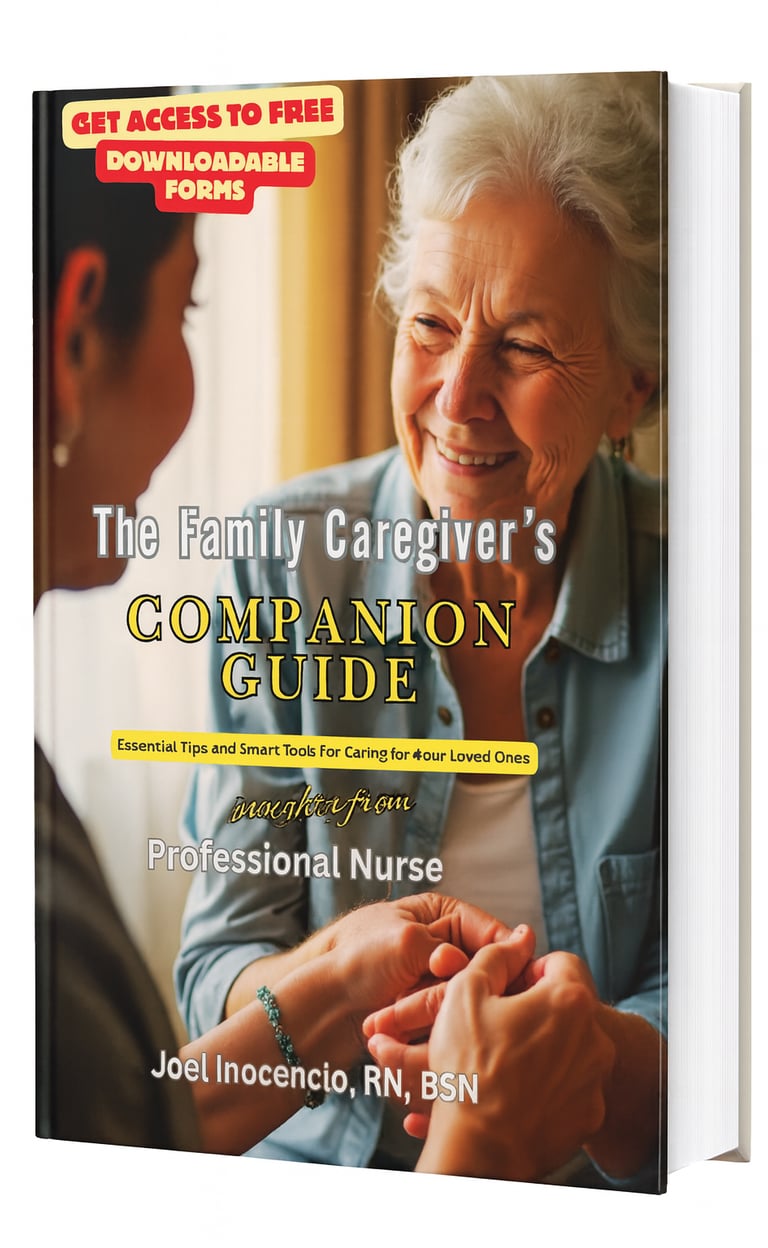 Inside The Family Caregivers Companion Guide: FREE downloadable “Quick Reference Checklists” (nurse-chart style daily documentation) + medication list.
